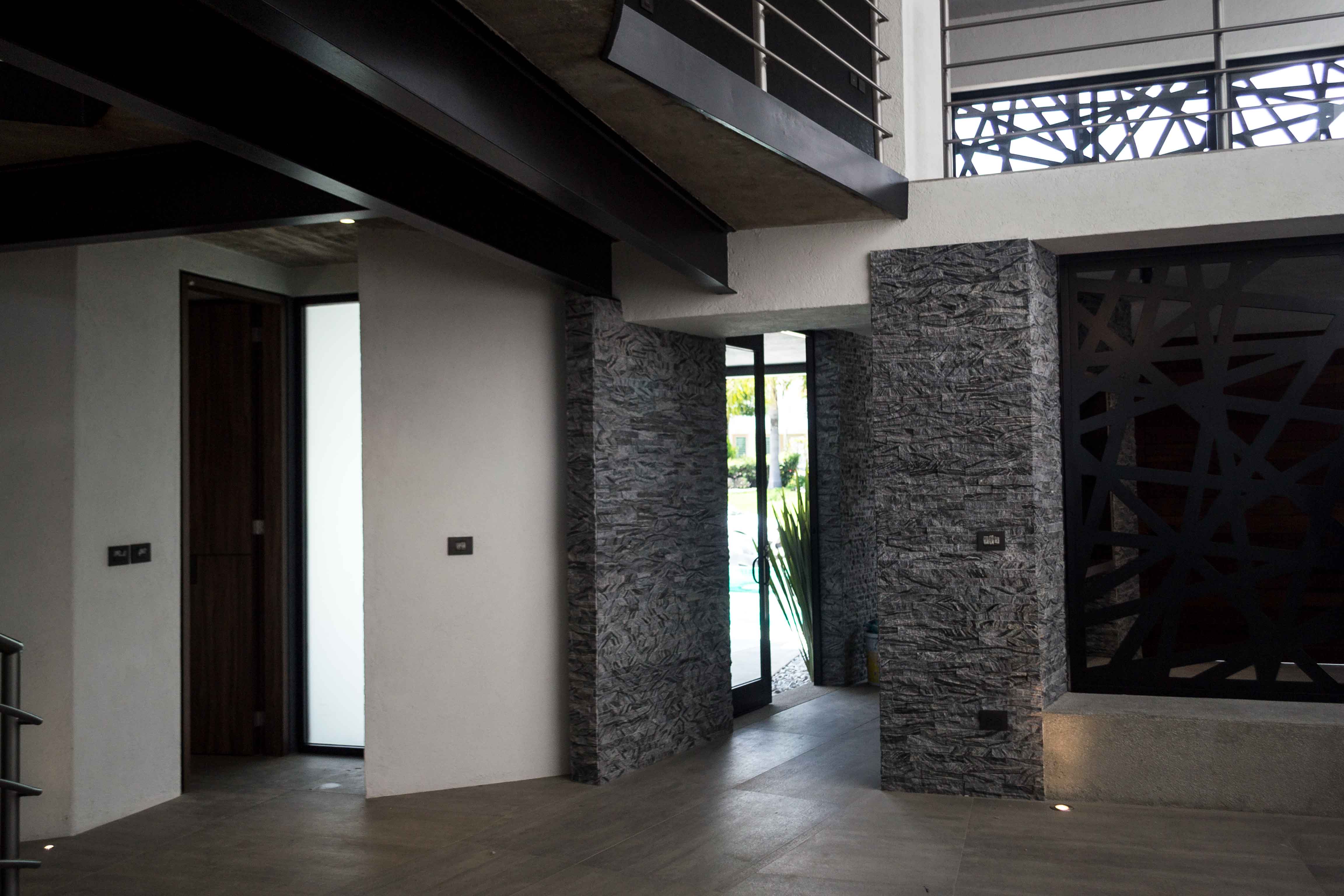 La selección de acabados finales fue, con la colaboración del Arq. Carballo, haciendo énfasis en la división de espacios abiertos por medio de los mismos. La pasta con más protagonismo en el proyecto es el Corevstone Pietra negro de la marca Corev, logrando así un buen balance entre texturas lisas y acabados con toques naturales y orgánicos. El diseño de la celosía exterior, fue diseñada a medida y basadas en especificaciones del Arq. Carballo y del cliente.